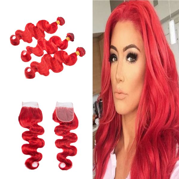 Bright Red Human Hair 3bundles Body Wavy With Lace Closure Body Wave Red Color Hair Weaves With Lace Closure Pieces Best Hair Weave For Black Women