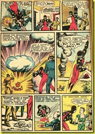 His powers, as efficiently explained in the opening two panels of the first story (Cole’s typical full-steam-ahead fashion) are flight and heat vision. When studying the superhero characters of late 1930’s and early 1940’s comics, it is important to realize that they were all (mostly successful) attempts to cash in on the great demand for superhero stories that began with the first appearance of SUPERMAN in 1938.